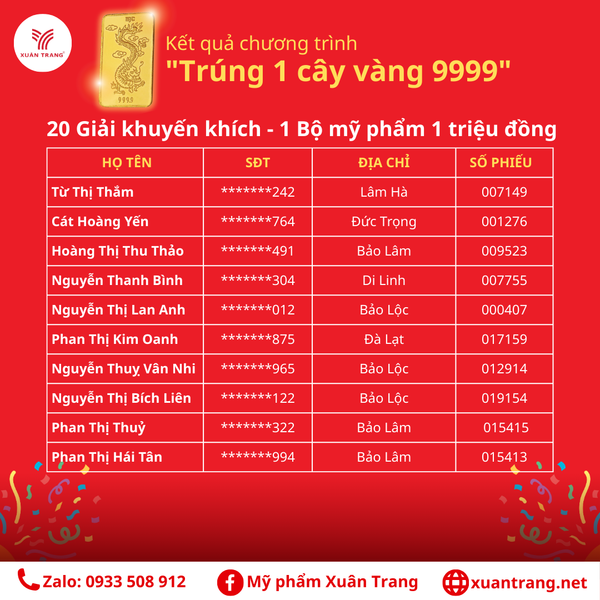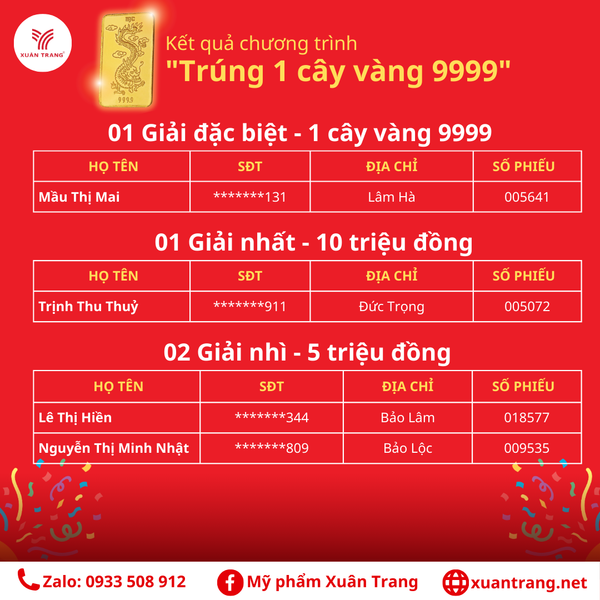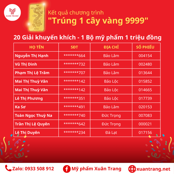 Cảm ơn Quý khách đã luôn ủng hộ cho Mỹ phẩm Xuân Trang! Đừng quên theo dõi để không bỏ lỡ các chương trình hấp dẫn tiếp theo! ![]()