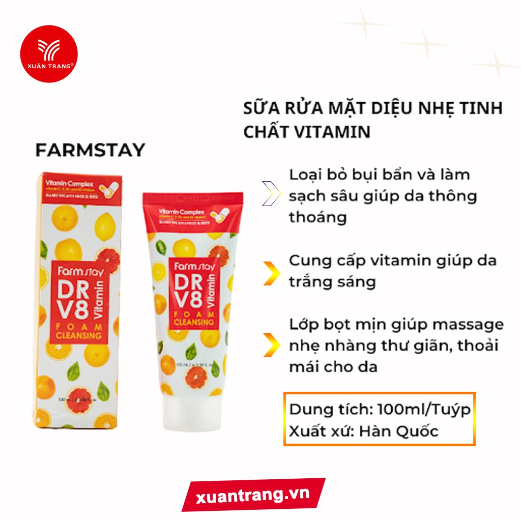 - Sữa Rửa Mặt Bổ Sung Vitamin C, E, B5 Farm Stay Dr-V8 Vitamin Foam Cleansing 100ml làm sạch da mặt thoáng mát với phức hợp vitamin. Nhẹ nhàng và làm sạch da khỏi mọi loại ô nhiễm, không làm căng và không gây khô và kích ứng.